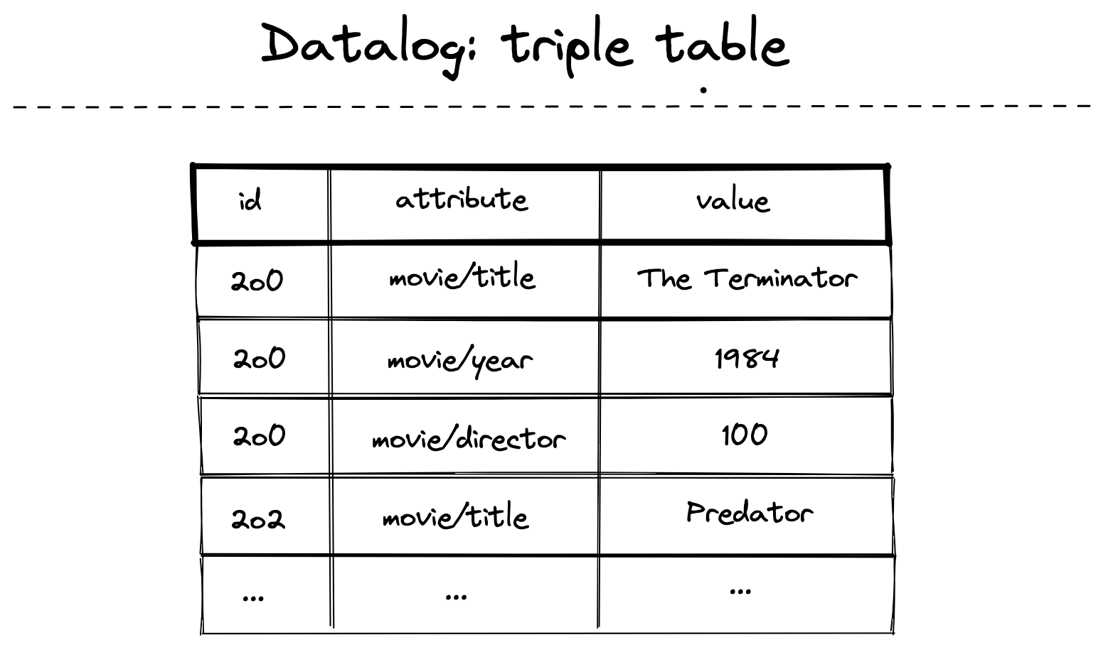 Our query engine runs through triple after triple. Since ?id can be anything, this matches every triple. But, the attribute movie/year and the value 1987 filter us down to just the triples we care about:
